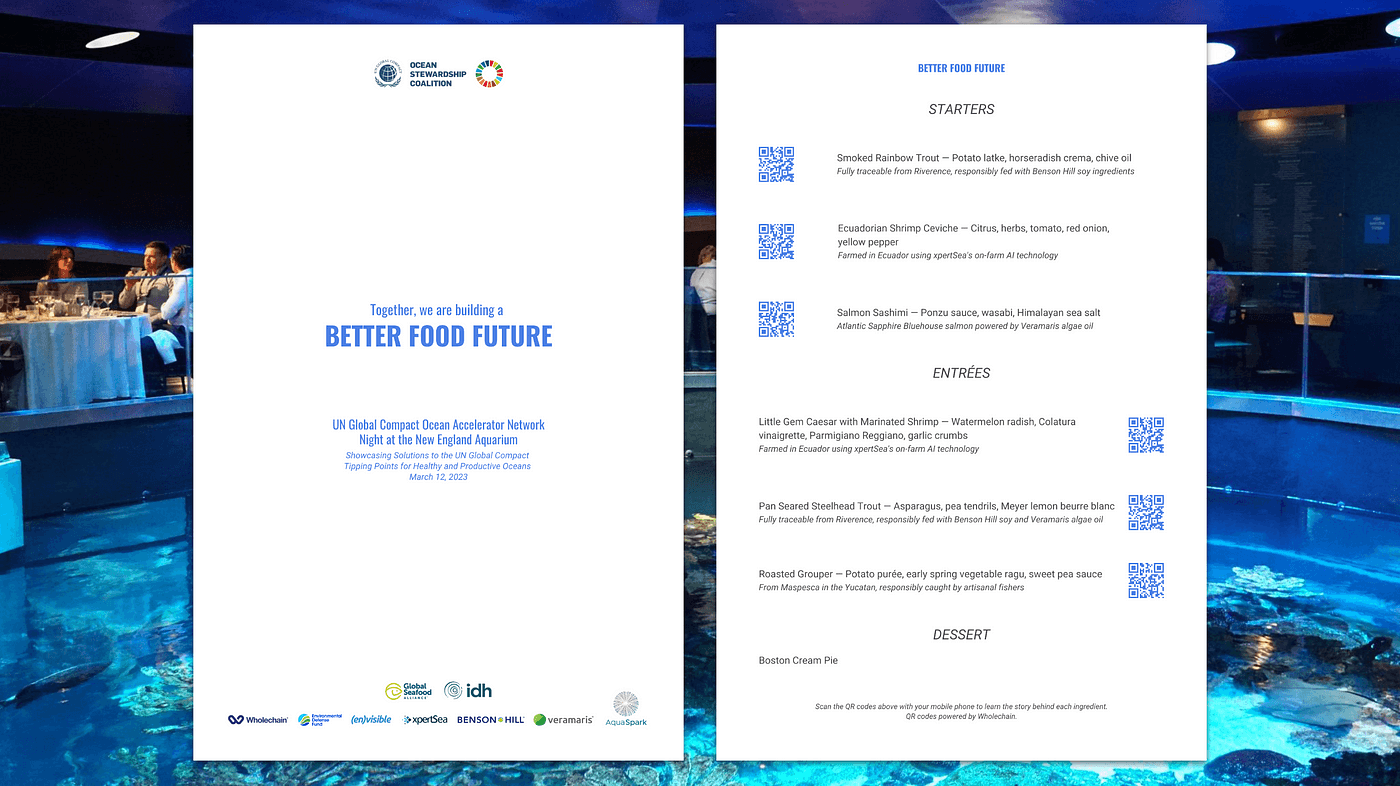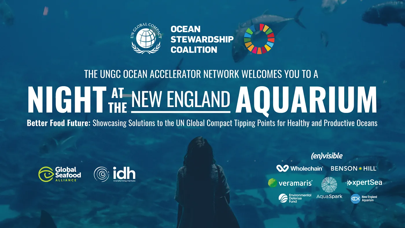 On March 12th, 2023, the UN Global Compact Ocean Stewardship Council hosted A Night at the New England Aquarium: Better Food Future, in collaboration with the UNGC Ocean Accelerator Network, Envisible LLC, the Global Seafood Alliance (GSA), and IDH: The Sustainable Trade Initiative. This exclusive event brought together seafood industry leaders, sustainability advocates, and technology innovators to discuss solutions for building a more transparent, responsible, and traceable seafood supply chain.