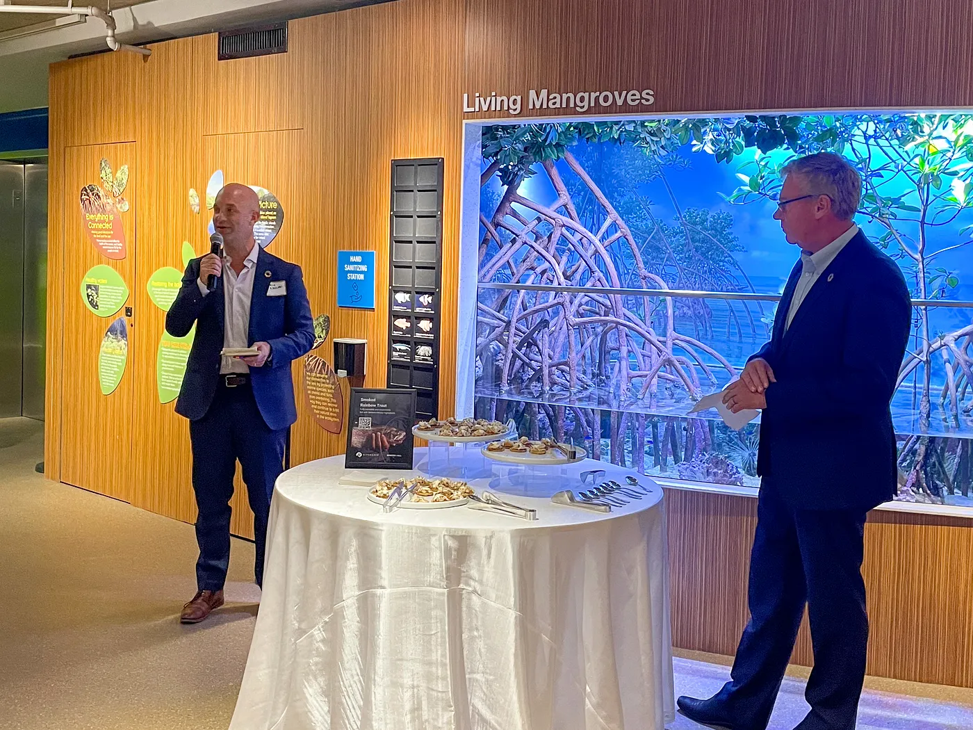 Set against the backdrop of the New England Aquarium’s immersive exhibits, the evening began in the Touch Tank Room, where Mark Kaplan (Envisible) and Martin Exel (SeaBOS) set the tone with a shared mission: advancing traceability, responsible sourcing, and sustainability in blue foods, in alignment with the UN Global Compact’s Tipping Points for Healthy and Productive Oceans.